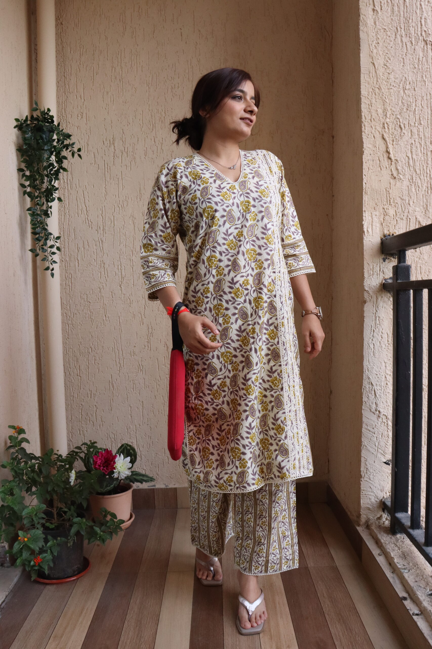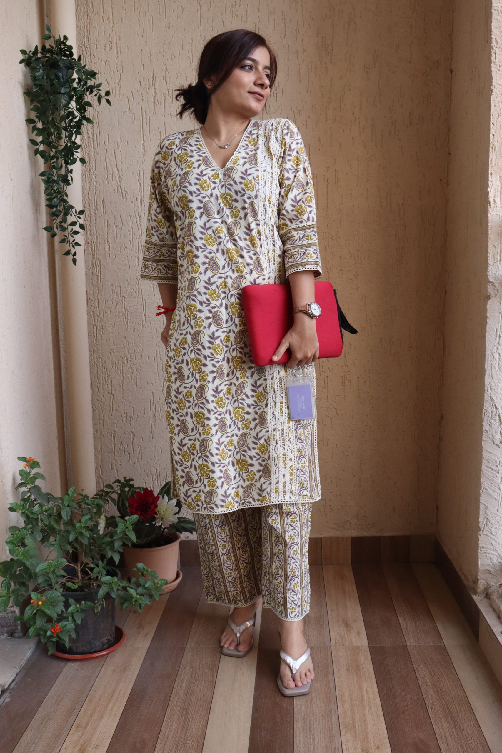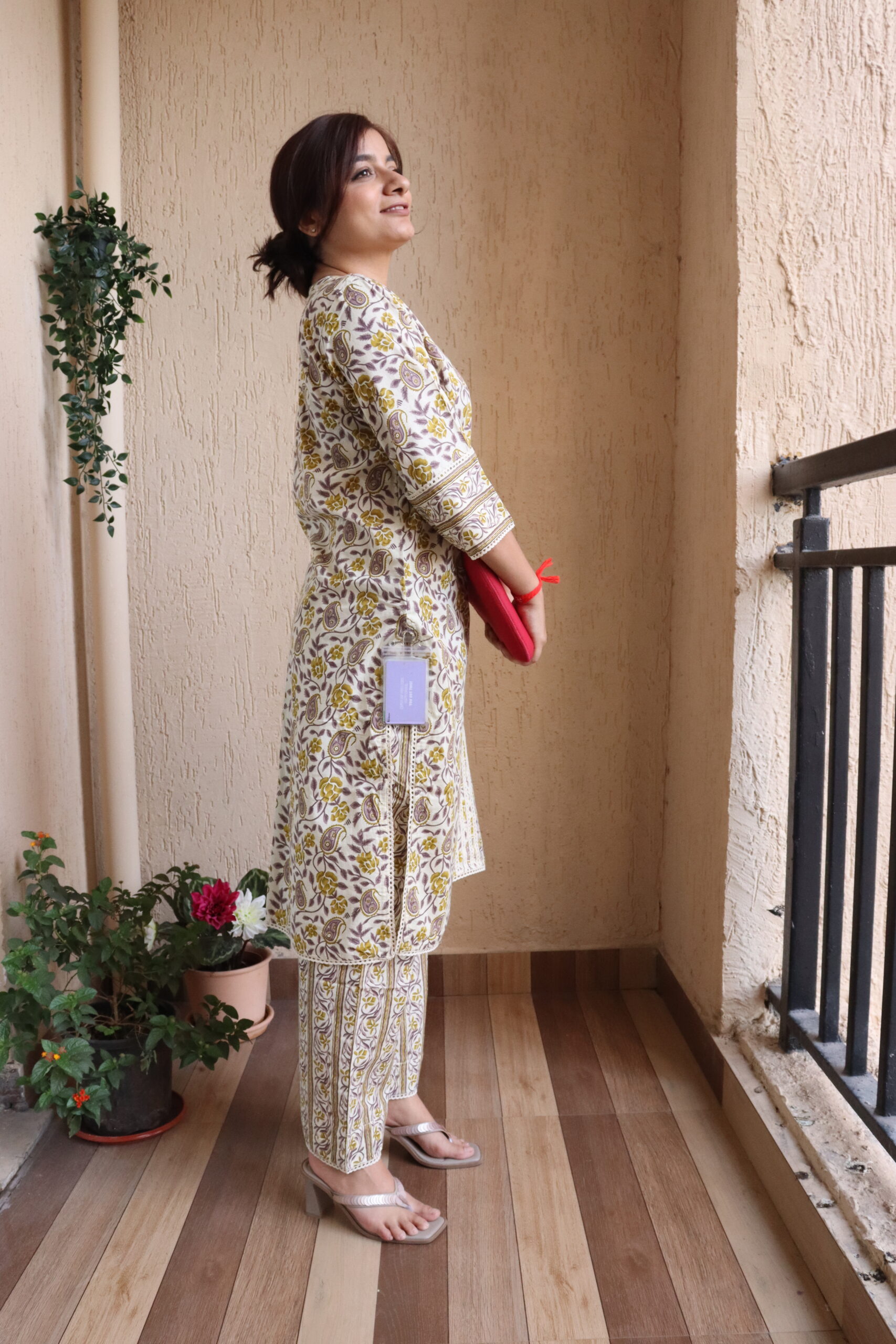 Pink and White floral kurti & pant set with umbrella sleeves for a dramatic, smart-casual look.