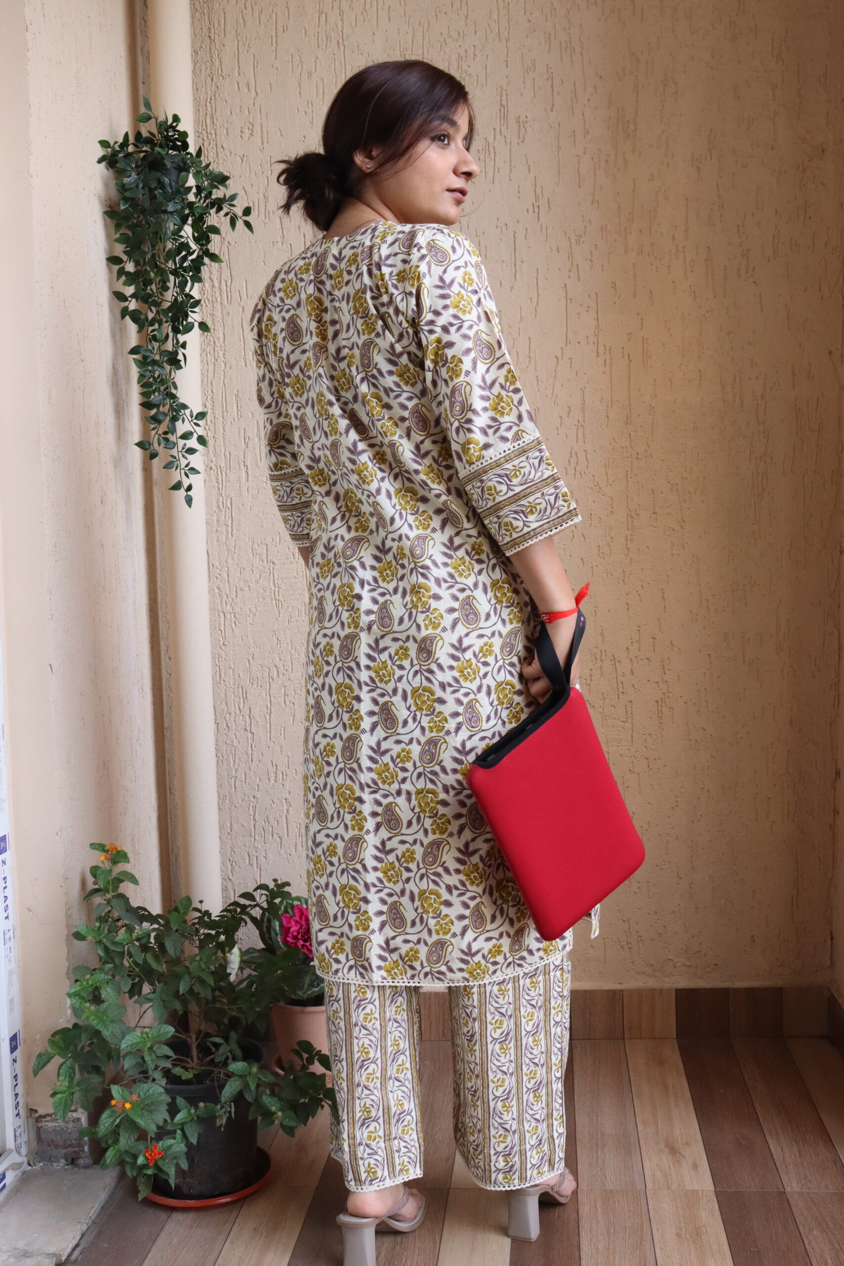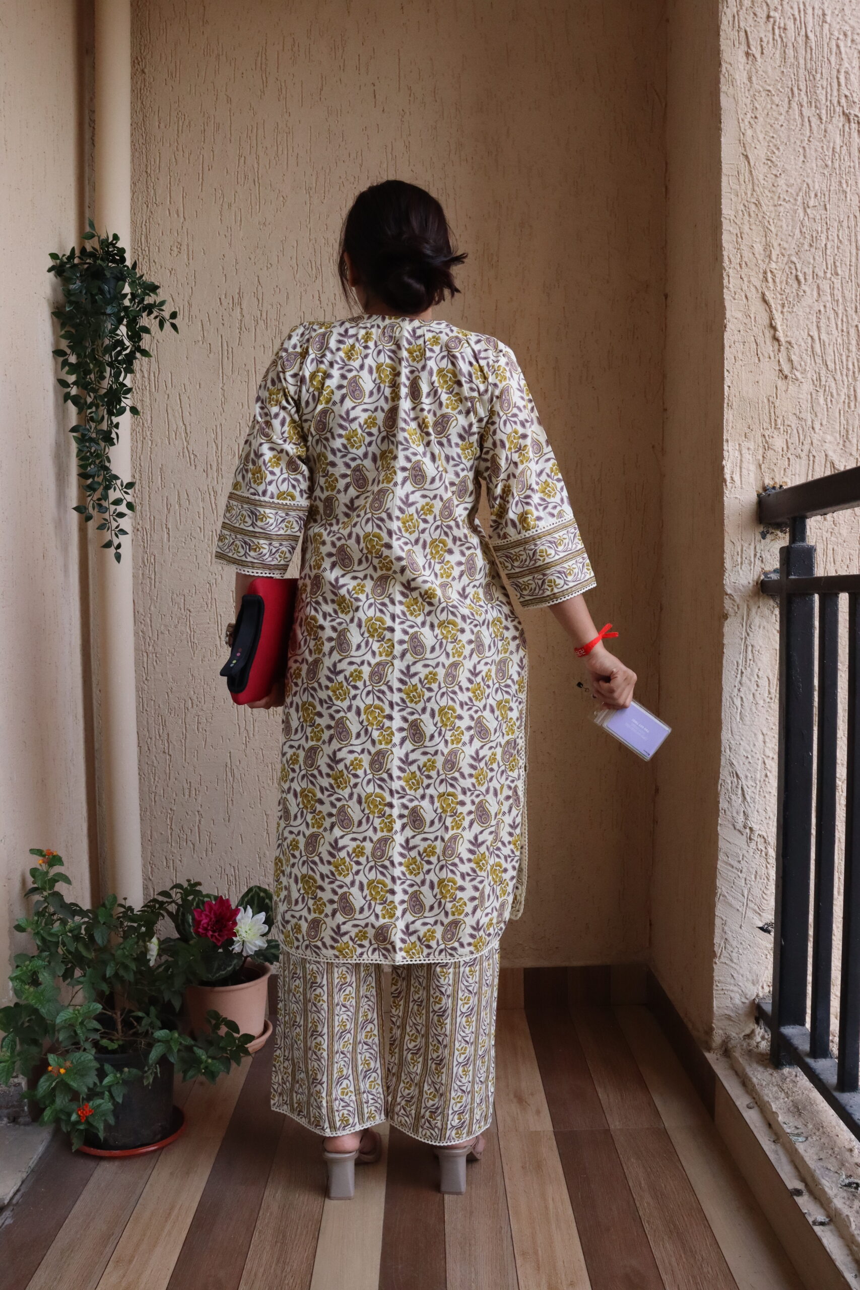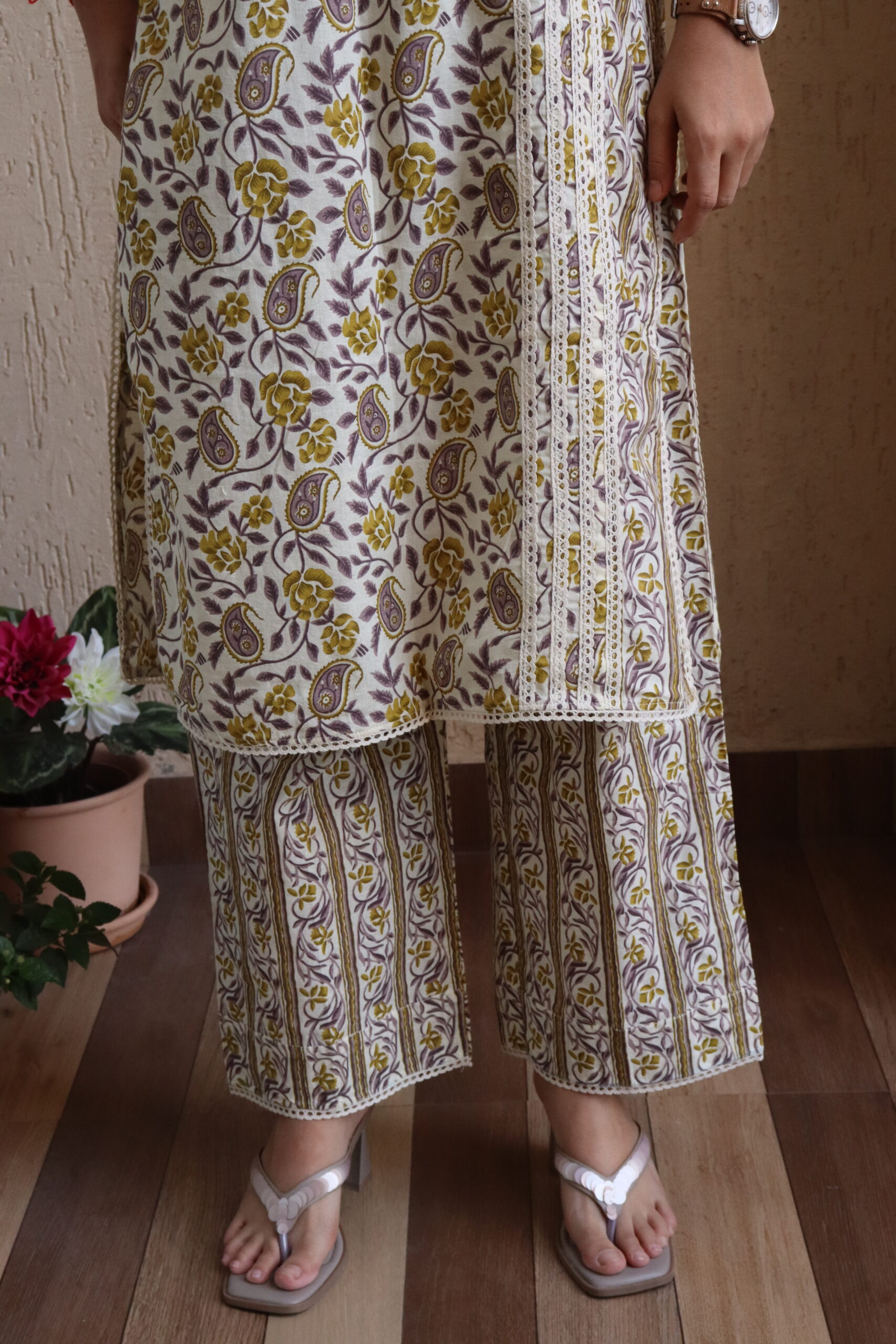 Pink and White floral kurti & pant set with umbrella sleeves for a dramatic, smart-casual look.